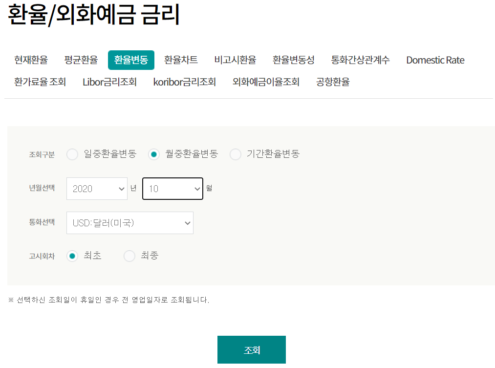 월중 환율변동을 누르시고 통화 선택에서 달러를 선택하신 후 조회를 누르시면 한 달 동안의 달러 환율을 보실 수 있습니다!