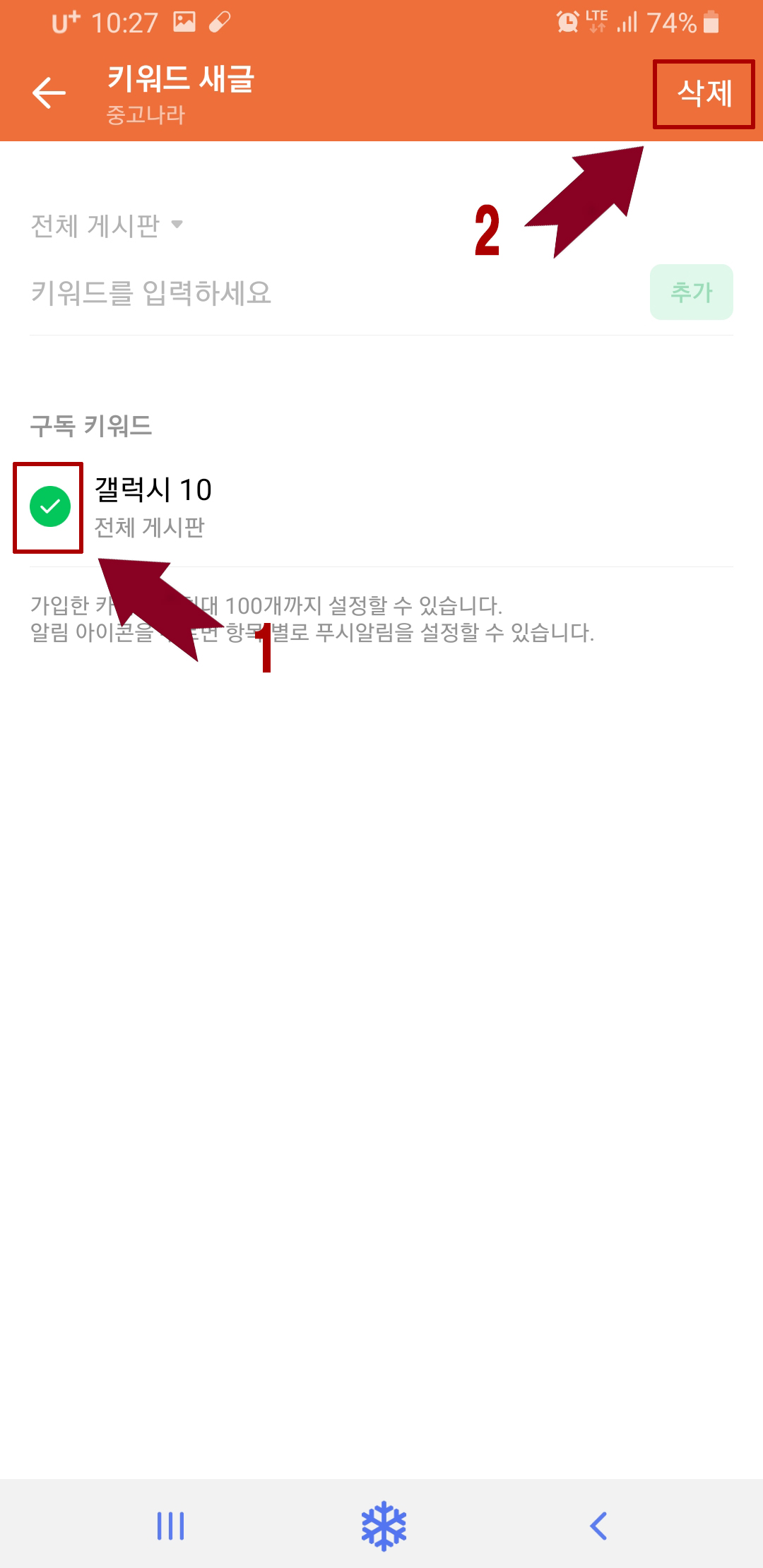 그리고 알림을 듣고 싶지 않을땐 키워드 새글에 들어가셔서 관리를 누르신후 삭제할 구독키워드에 체크하고 삭제를 눌러주시면 푸시알림만 끄기와 구독해제를 선택하실수 있습니다