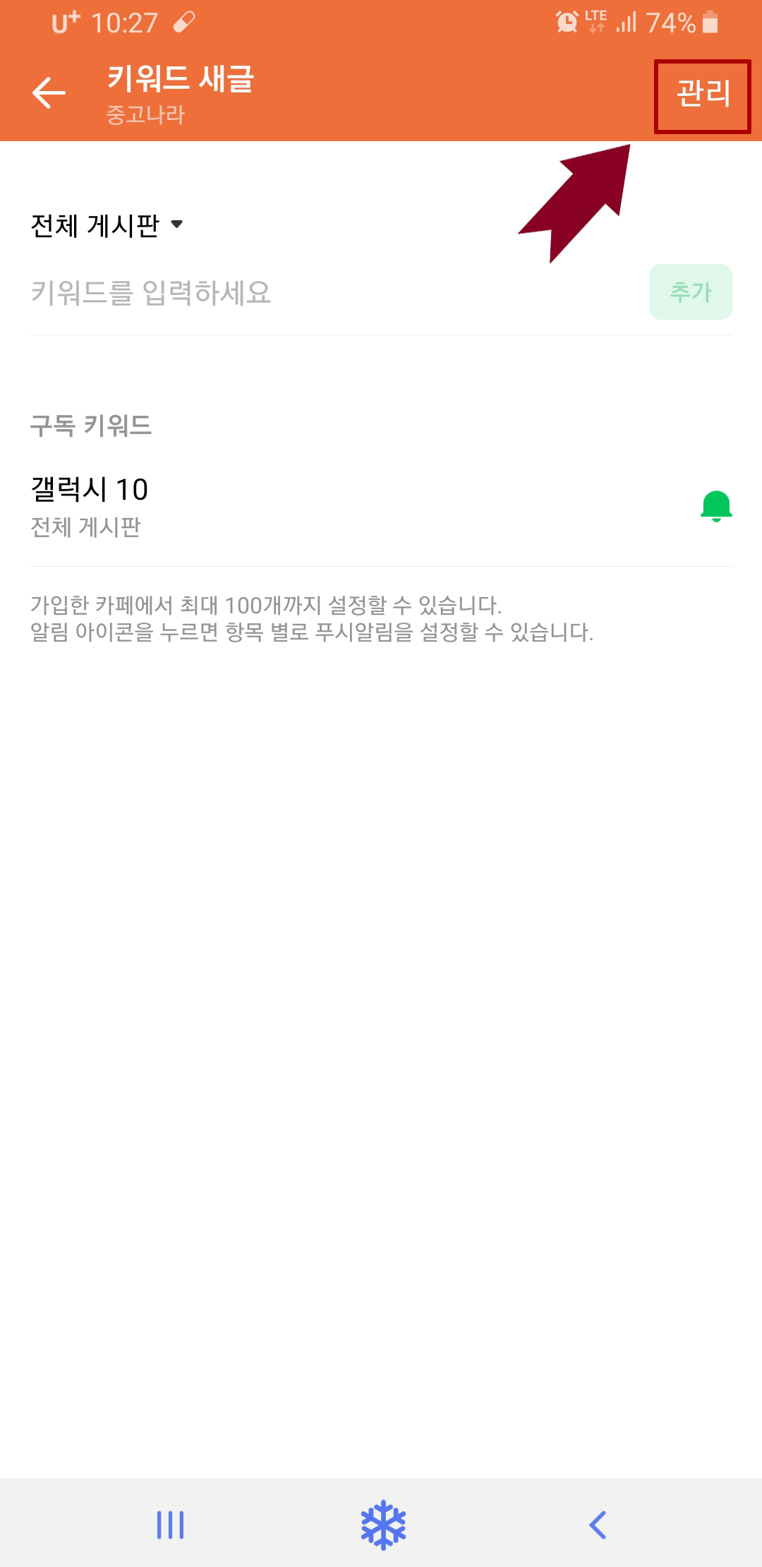 자 그러면 이제 키워드 알림 설정을 위해 제일 하단에 있는 종모양을 터치해줍니다!