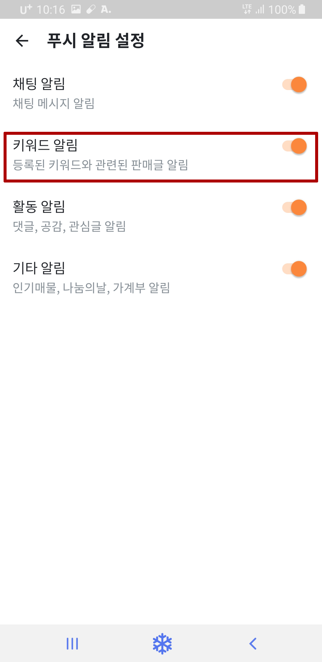 또한 키워드 알림을 받고 싶지 않으시다면 나의 당근에 들어가신 후 우측 상단에 동그란 설정 버튼으로 들어가셔서 푸시 알림 설정을 누르시고 키워드 알림을 꺼주시면 됩니다!