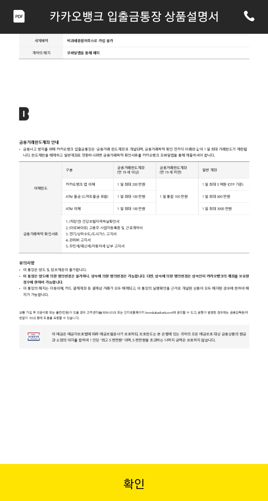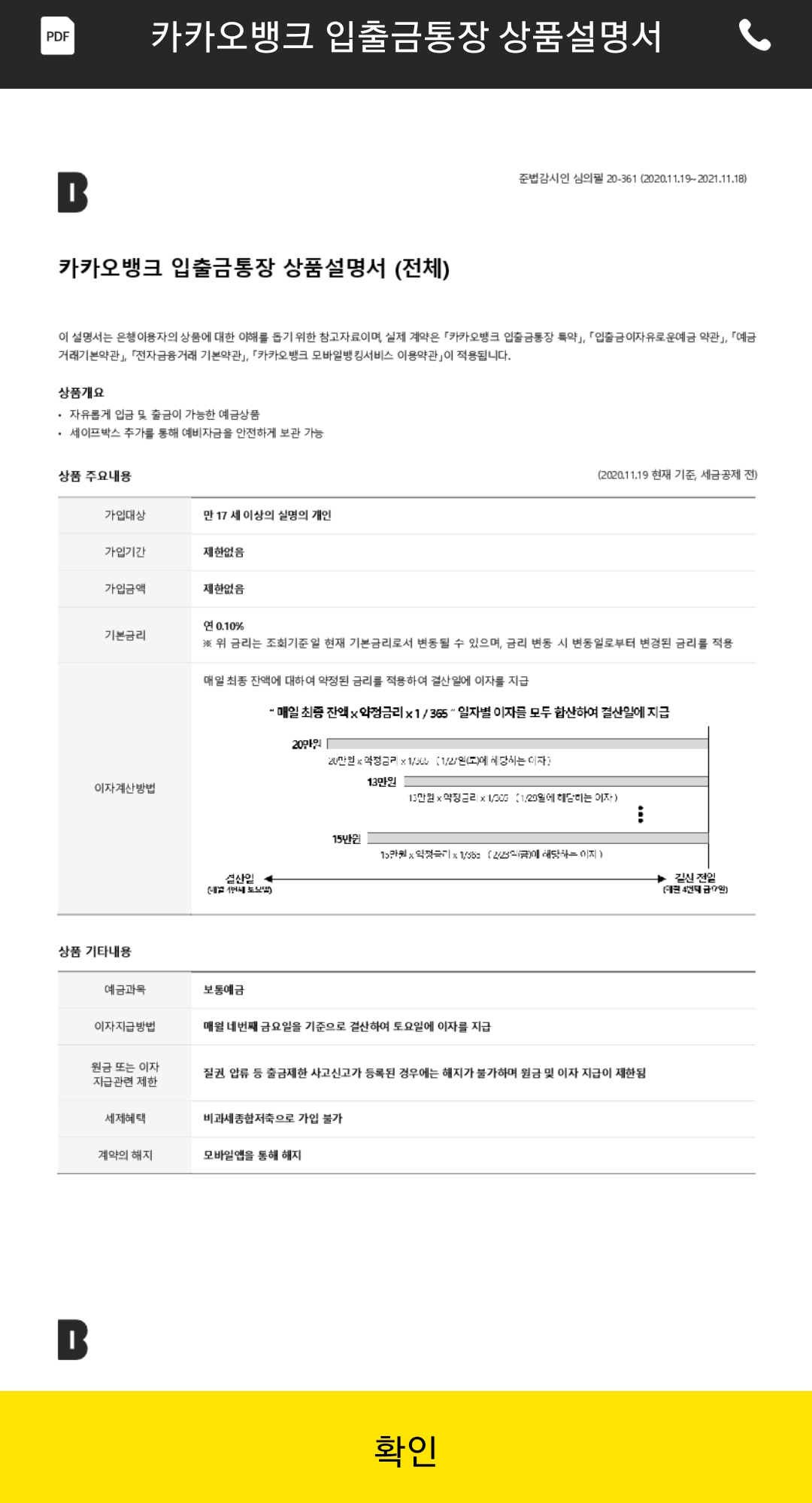 카카오 뱅크 입출금통장 상품 설명서가 나옵니다.