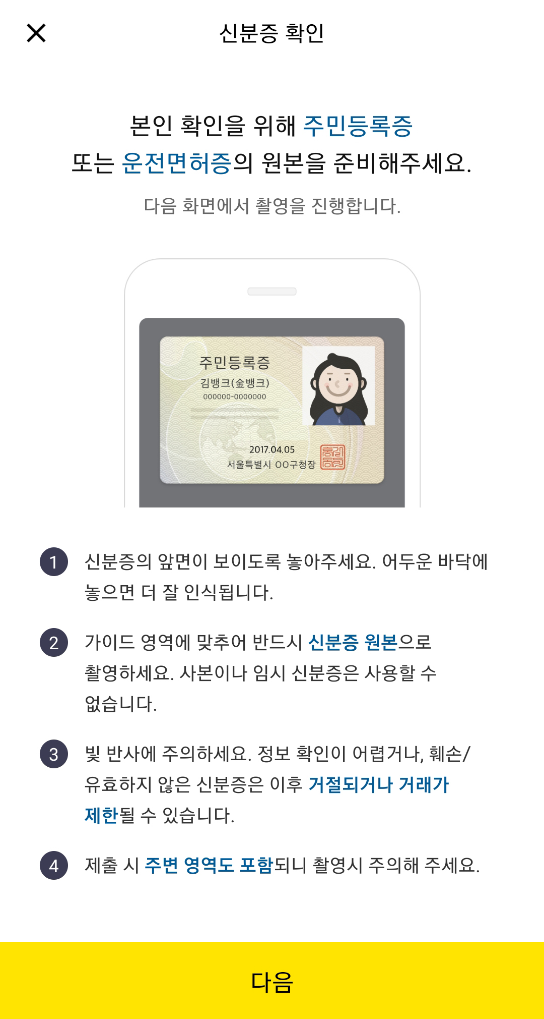 다음 신분증을 촬영하여 확인절차를 거칩니다.