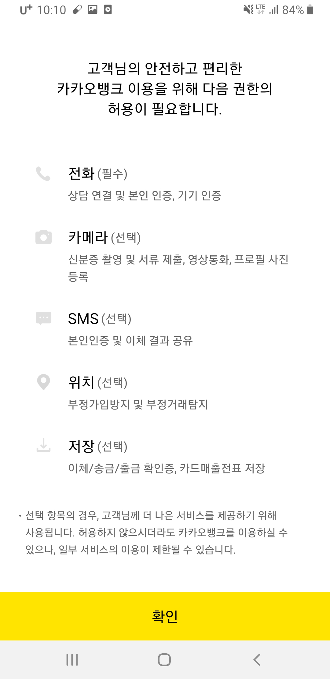 고객님의 안전하고 편리한 카카오 뱅크 이용위해 다음 권한의 허용이 필요합니다라는 의례적인 절차를 거쳐줍니다!