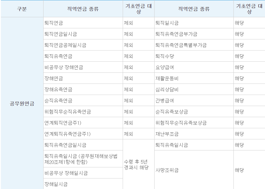 단 기초연금 수급대상에서 제외되시는 분들이 있는데 일단 공무원연금을 받고 계시거나 사립학교 교직원 연금, 군인연금, 별정우체국연금을 받고 계신 분 그리고 그 배우자가 해당됩니다.