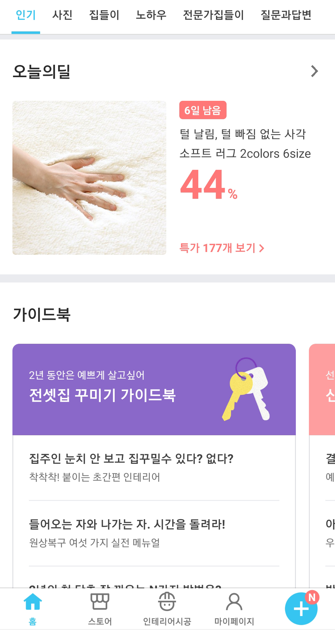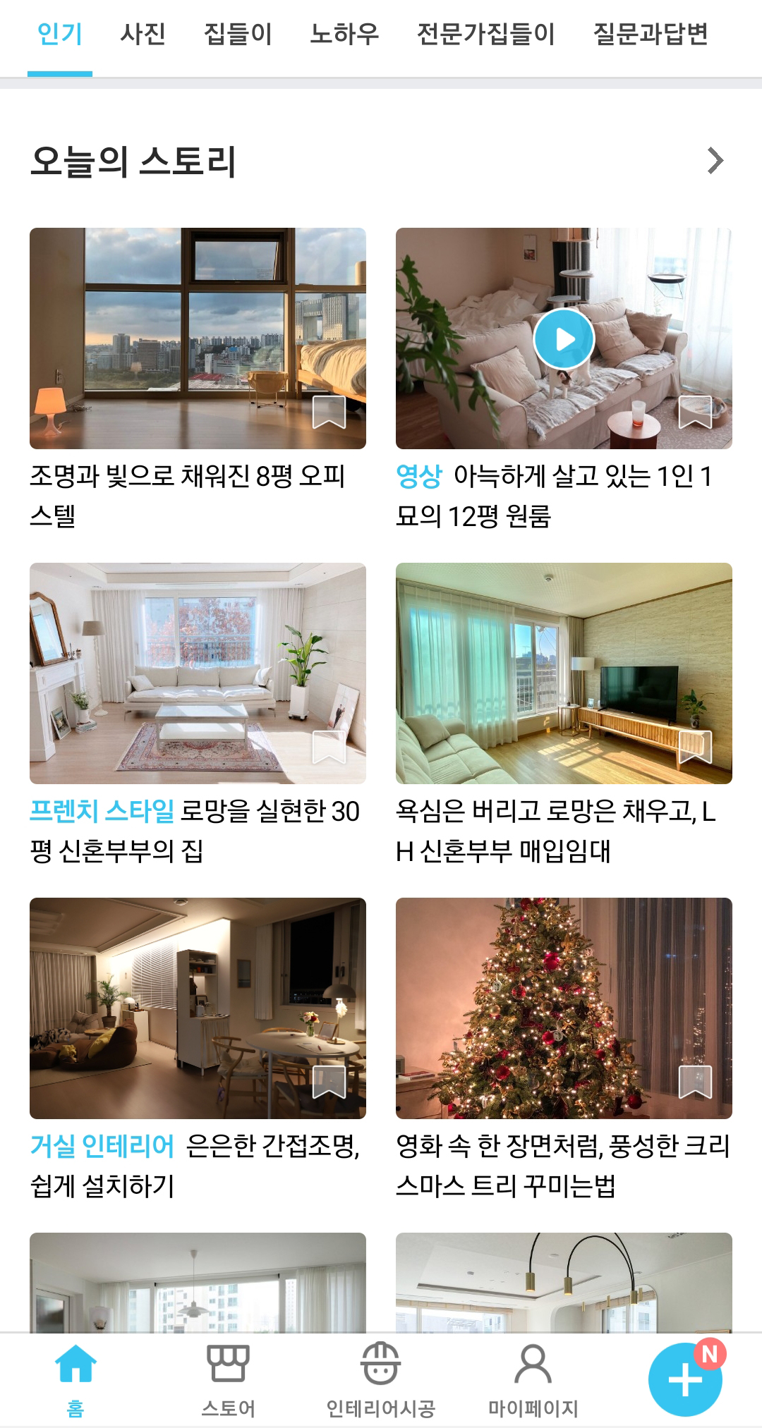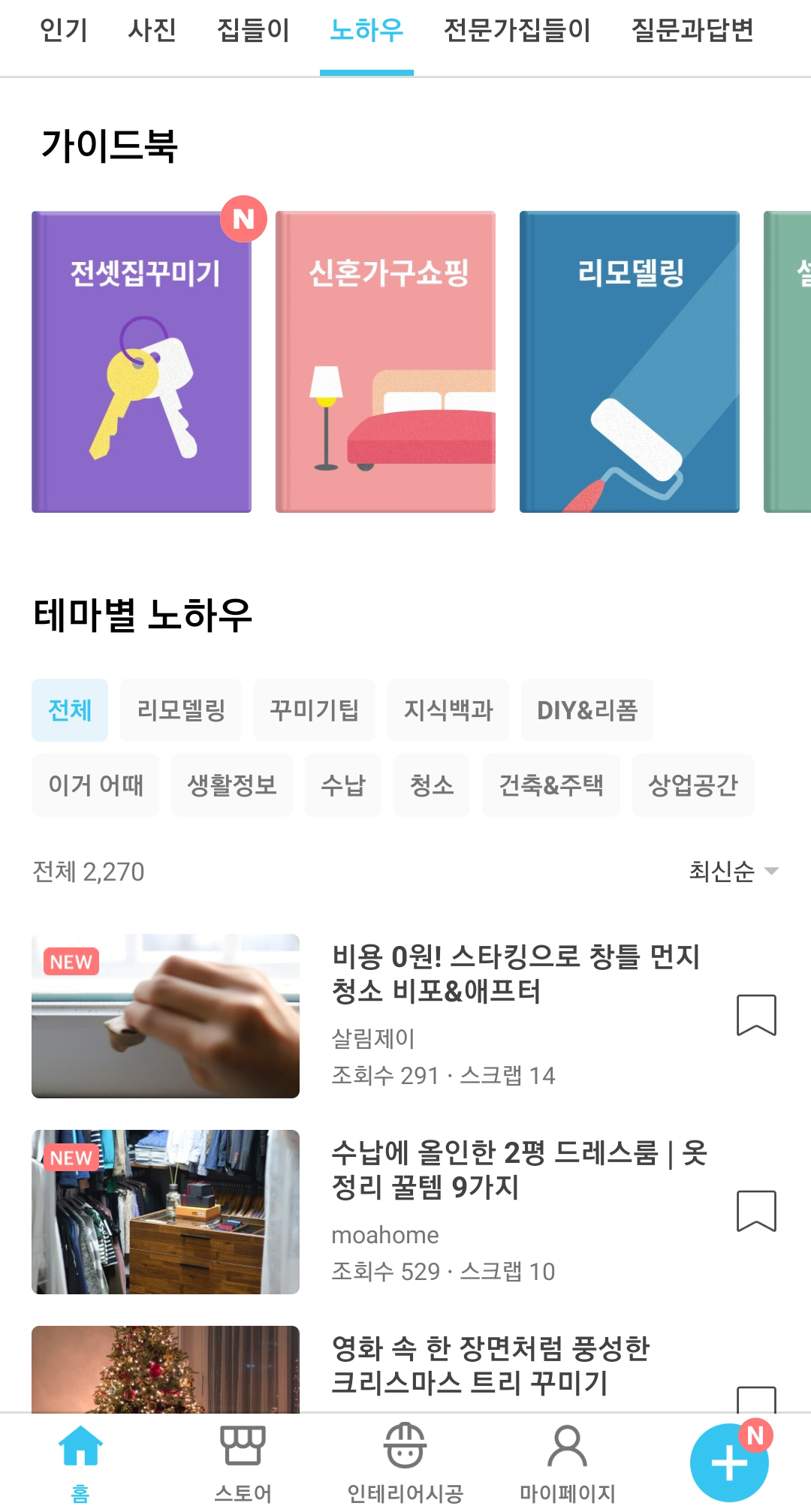 상단 메뉴엔 인기, 사진, 집들이, 노하우, 전문가 집들이, 질문과 답변 이렇게 여섯 가지의 메뉴가 있습니다.