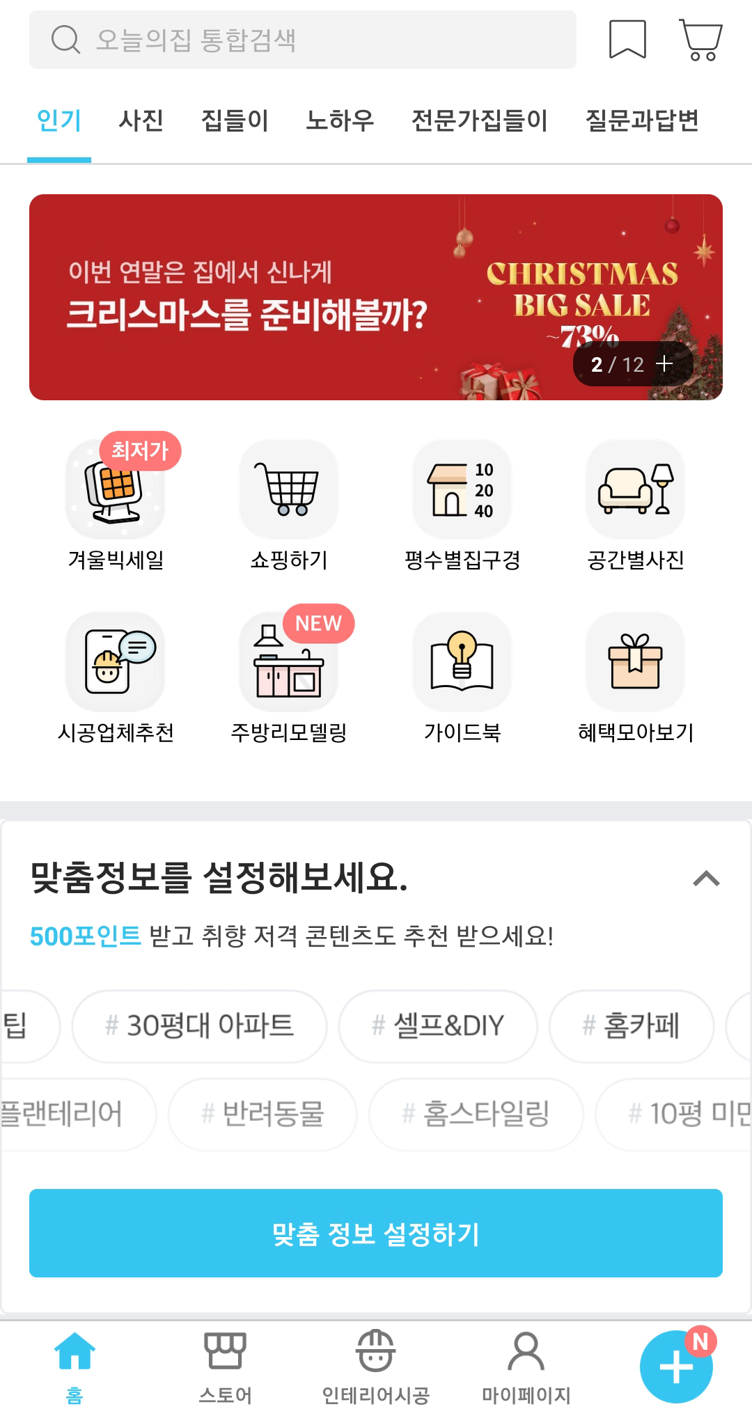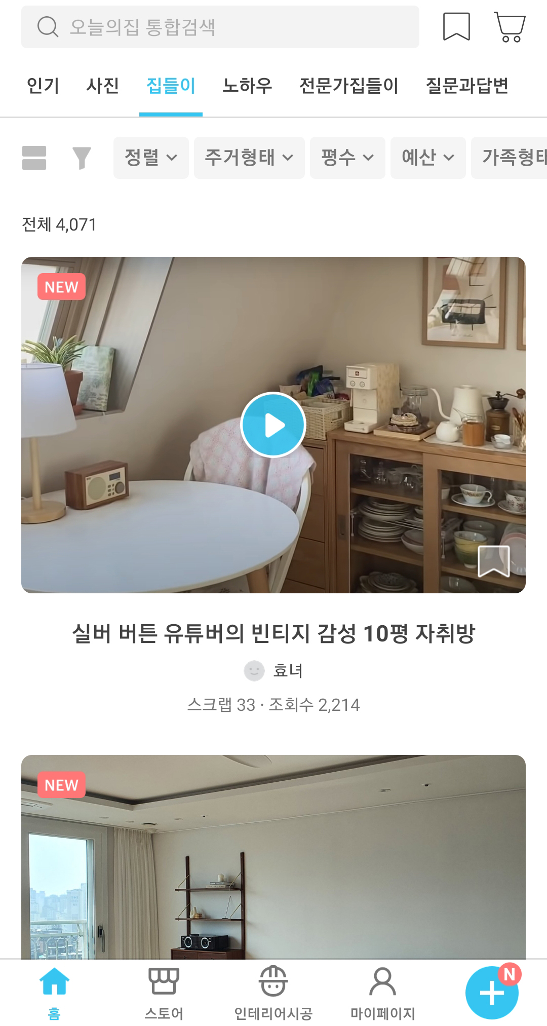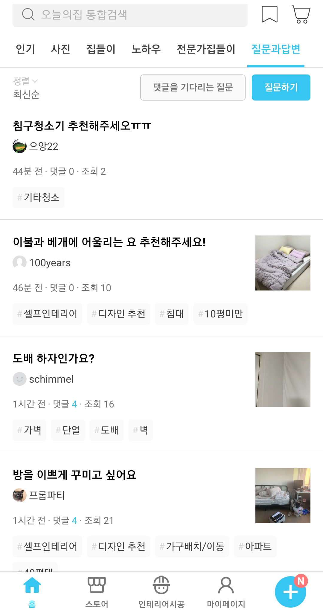 상단 메뉴엔 인기, 사진, 집들이, 노하우, 전문가 집들이, 질문과 답변 이렇게 여섯 가지의 메뉴가 있습니다.
