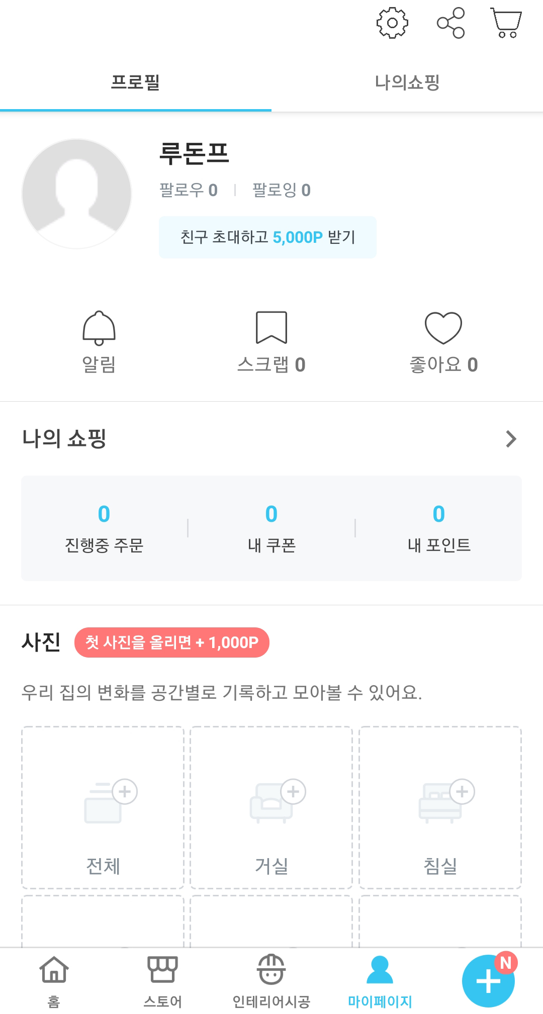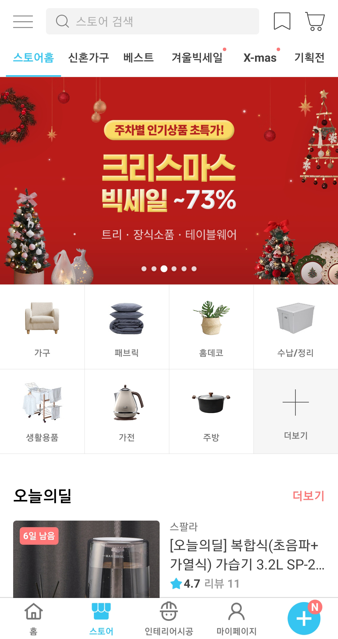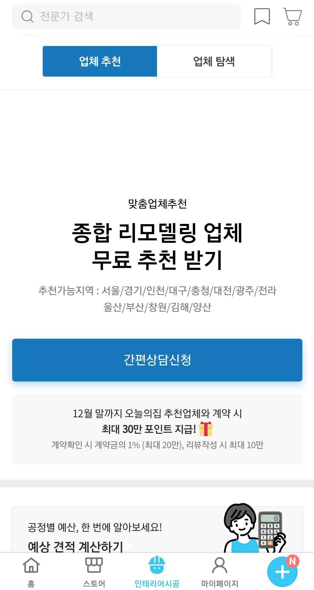 마지막으로 하단 메뉴에서는 스토어, 인테리어시공업체, 마이페이지 등을 보실 수 있습니다!