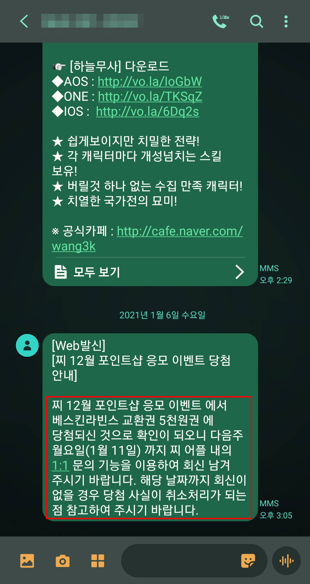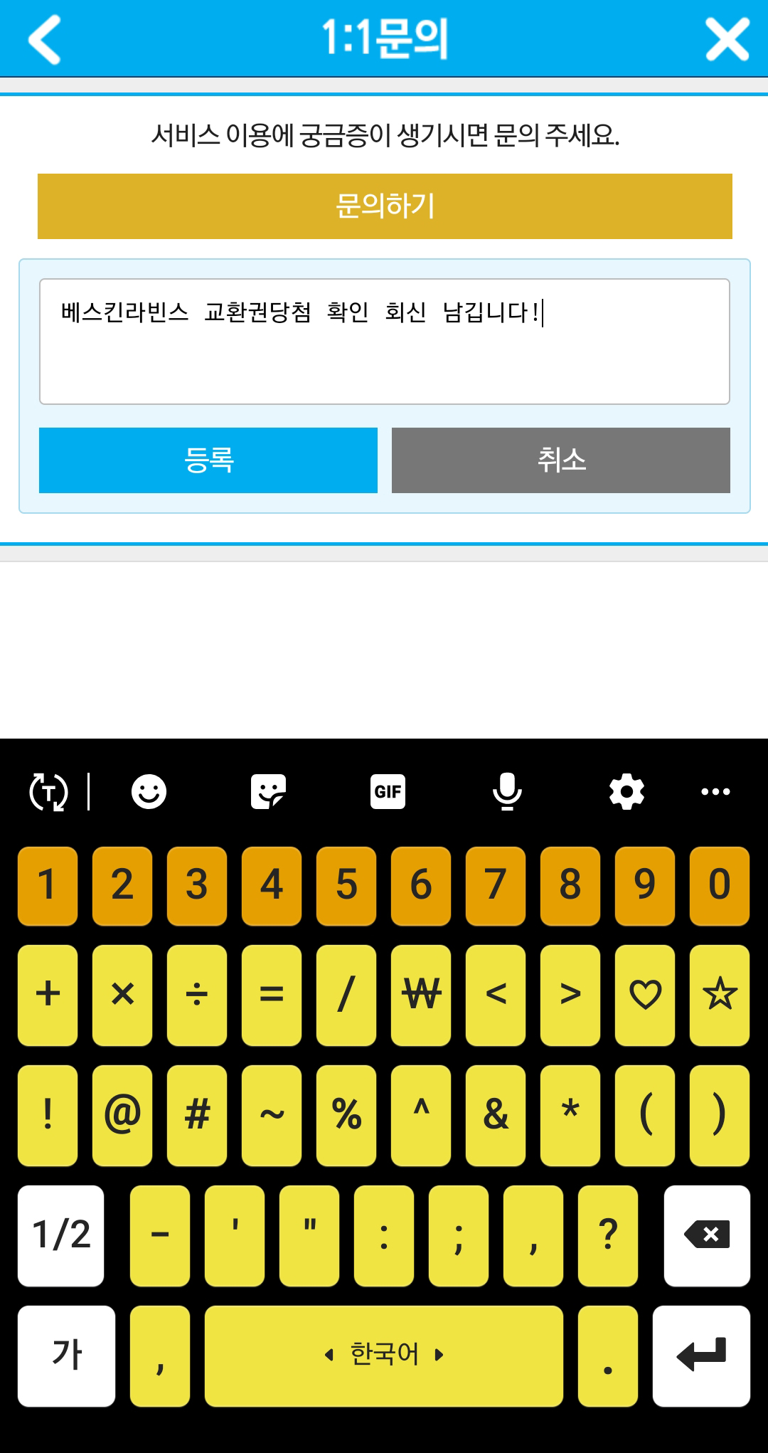 당첨되었다는 문자를 받았으면 1:1문의에 들어가 회신을 남겨줘야해요!