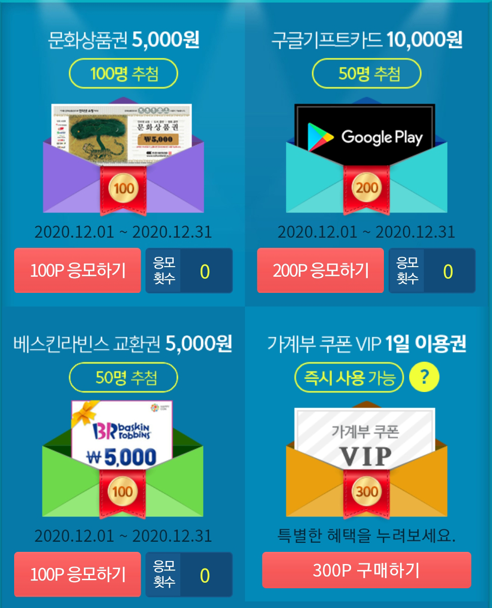 이 포인트로 문화상품권, 구글 기프트카드, 베스킨라빈스, 가계부쿠폰등을 전부 응모하실 수 있고 매달 추첨을 통해 상품을 받으실 수 있답니다!