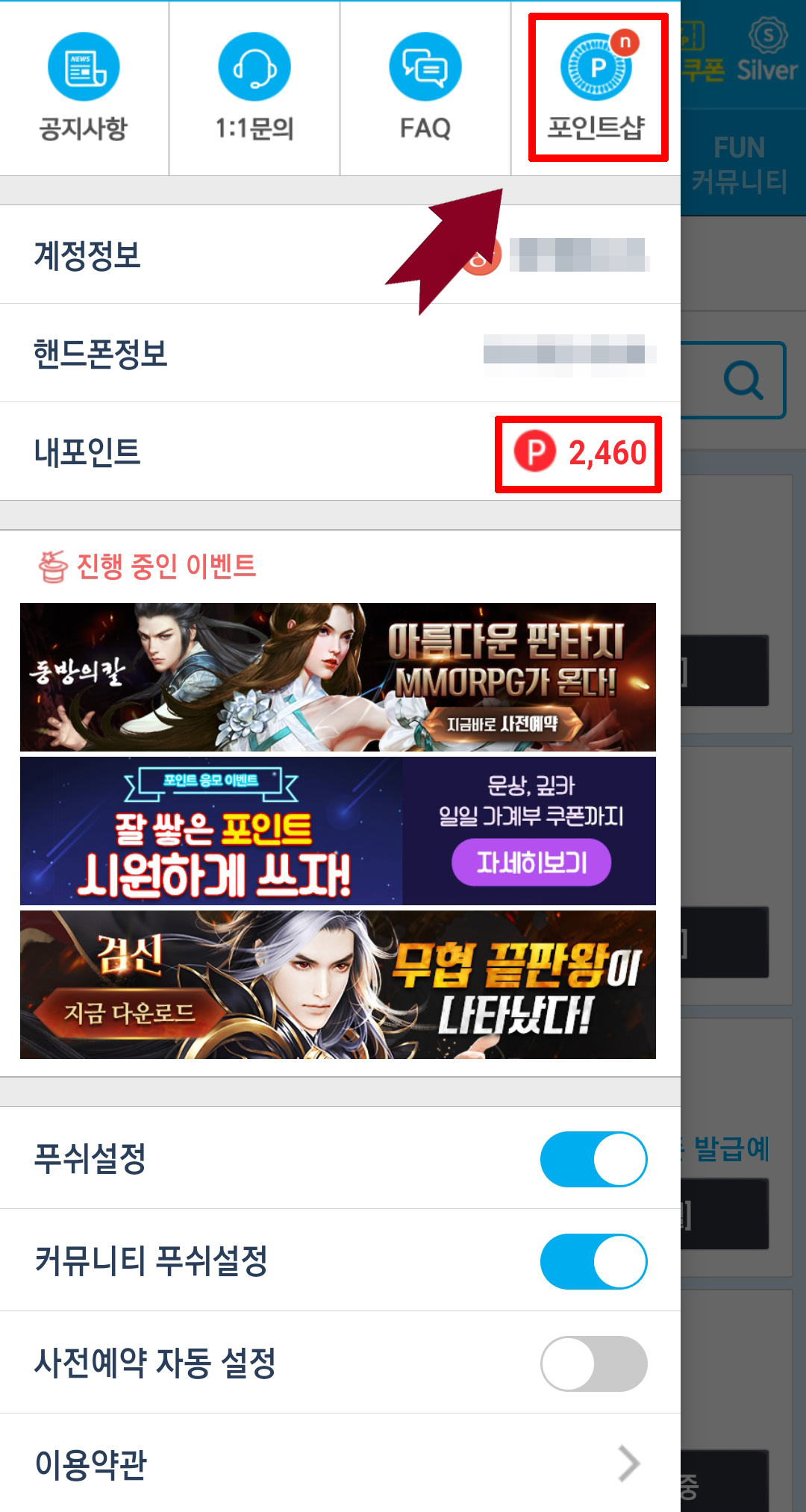 가장 핵심인 포인트 샾 이용을 하실 수 있습니다.