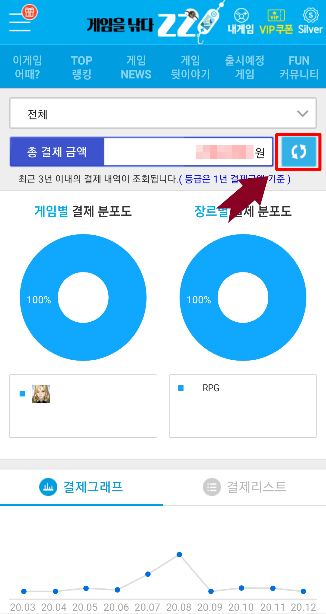총 결제 금액 옆에 있는 새로고침을 누르면 본인의 구글 플레이 유료결제 액수를 분석하고 등급을 매겨주는데요!